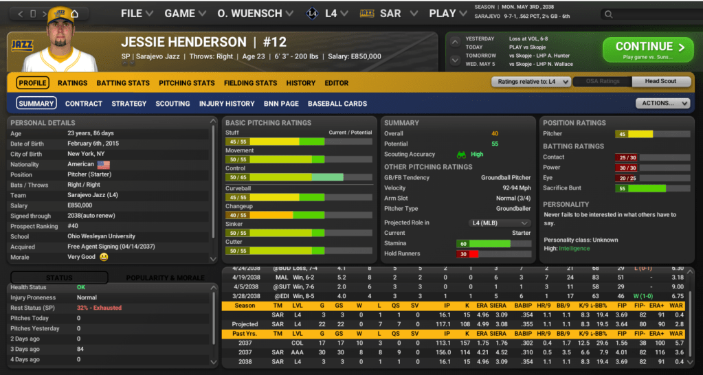 These are just a few examples of the change in philosophy that many believed Oliver Wuensch would bring to the club. The 2037-38 offseason drew upon the same strategy that the Jazz had applied the season prior: stock up on prospects and supply enough current talent to field a competitive team. Owner Mickael Lesage publicly set the goal for Sarajevo at a .500 record by the end of 2038. Rookie starting pitcher Jessie Henderson was getting the call up to start the season on the opening day roster and slot into the rotation. Henderson was, for some reason, released by the Charlotte Otters of the Southern United States Baseball League (one of the five leagues part of the North American Baseball Association) in March of 2037, and was signed to a major league contract less than a month later by Wuensch and the Sarajevo Jazz. He was immediately named a top 30 prospect in League 4 just two days after signing, and the Jazz have hopes that he’s able to develop into a top-of-the-rotation arm over the next couple of seasons.