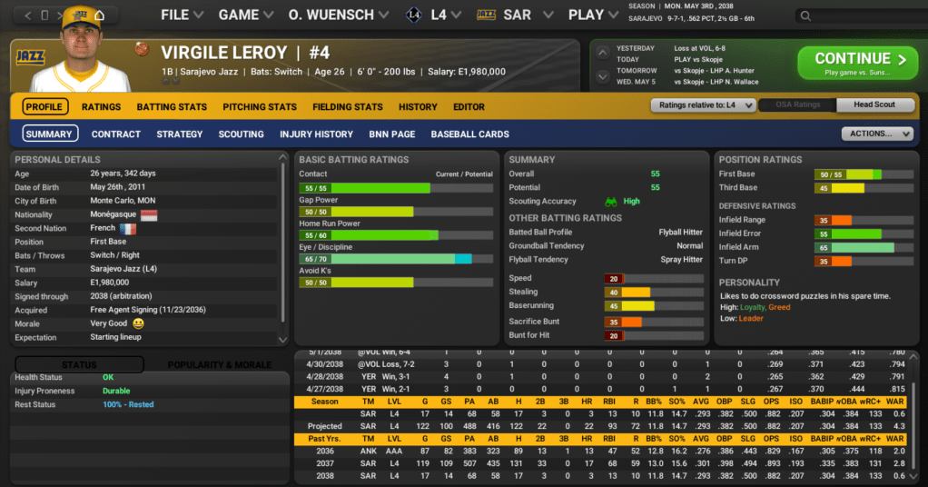 The 2037 season, Wuensch’s first at the helm, ended with Sarajevo in 16th place in League 4, their worst finish to date. The team focused on bringing in prospects over veterans, hoping to build a strong farm system that they will be able to pull from in future seasons. The Jazz did have some bright spots on their roster, including outfielder Afbin Kasaba and first baseman Virgile Leroy. Kasaba, the now 25-year-old Turkey international, finished the 2037 season with a 141 wRC+ and 3.5 WAR while splitting time between left field and designated hitter. Leroy, who put up 2.8 WAR and a 131 wRC+, has a distinct connection with the new Jazz GM. Leroy was selected 24th overall by the Ankara Coyotes in the 2031 Draft, one of the last selections of the Wuensch era in Ankara. The new administration in west-central Turkey didn’t have Leroy in their long-term plans however. He ended up playing four and a half seasons for AAA Ankara, winning the league’s MVP award twice, while finishing in second place following the back-to-back trophies. Wuensch made signing Leroy a priority once he became a Free Agent, and it paid off in his first season with Sarajevo, winning the League 4 Rookie of the Year award in 2037.